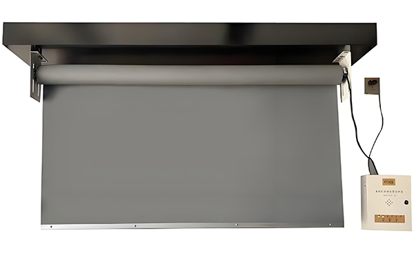 连接电源线和控制线,将东城街道挡烟垂壁安装在支架上,并用螺丝固定。